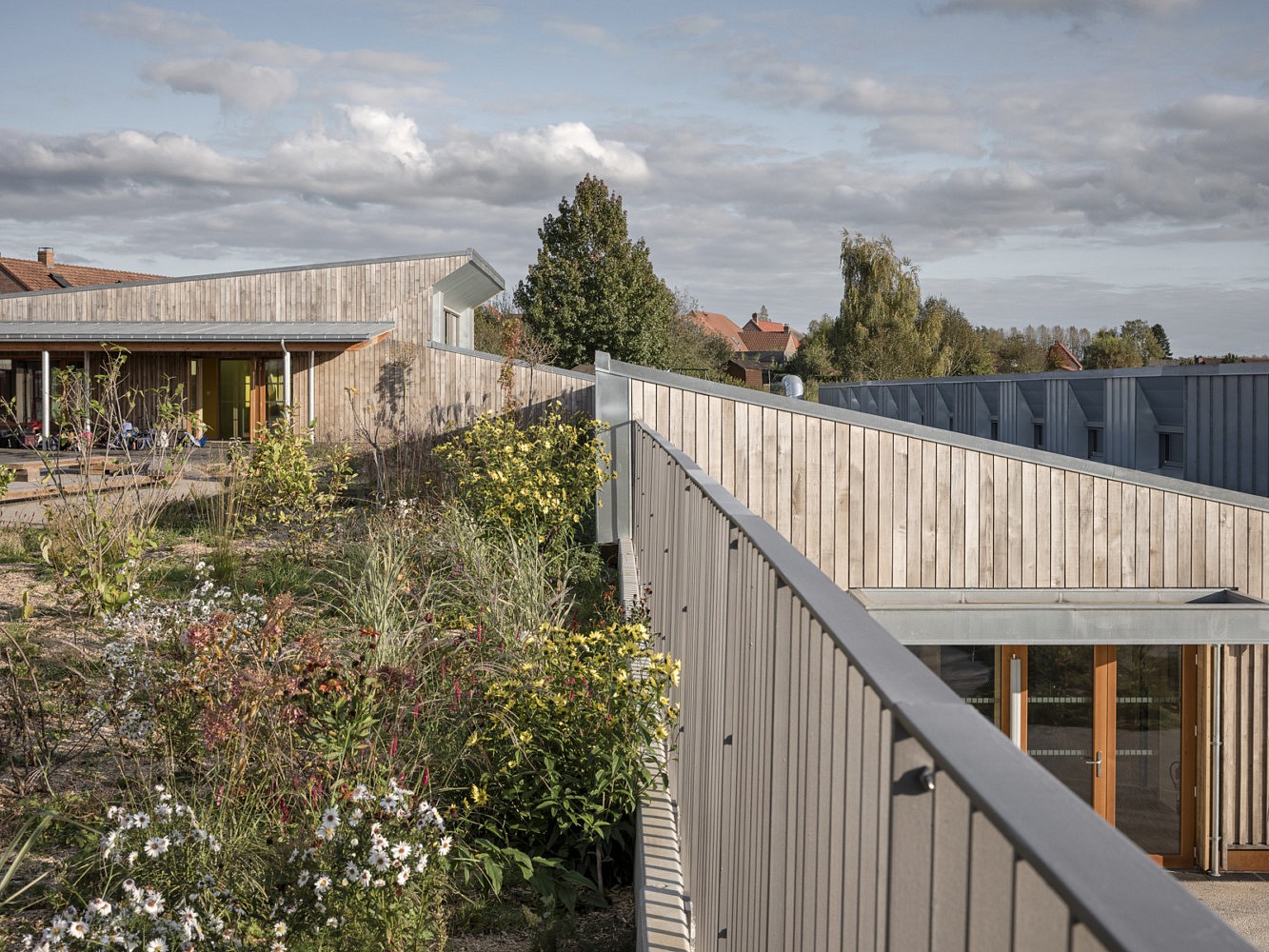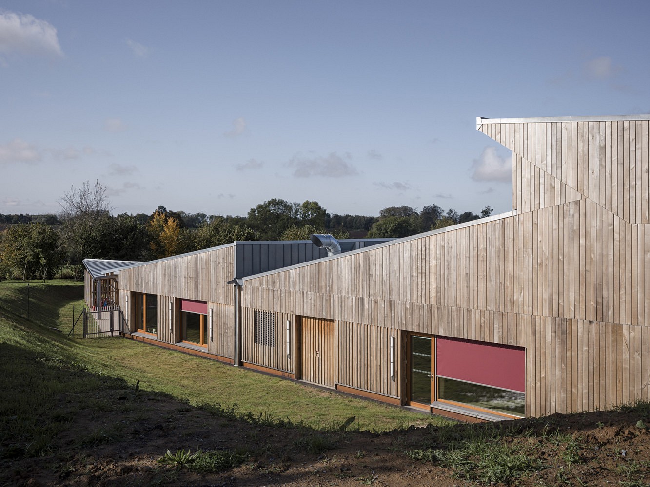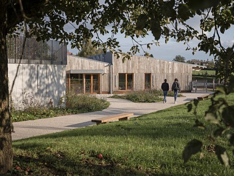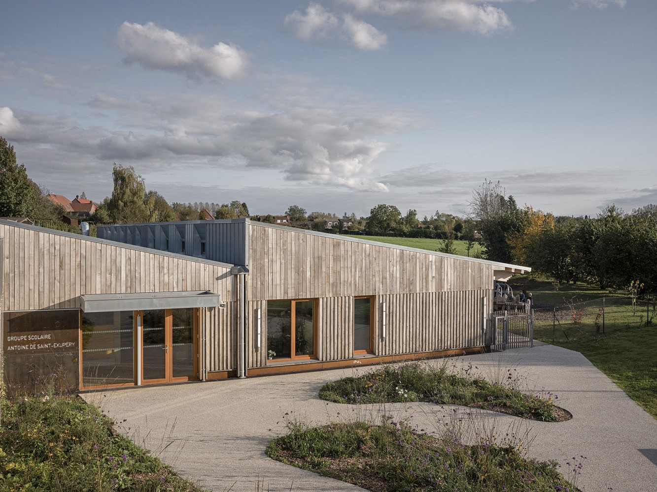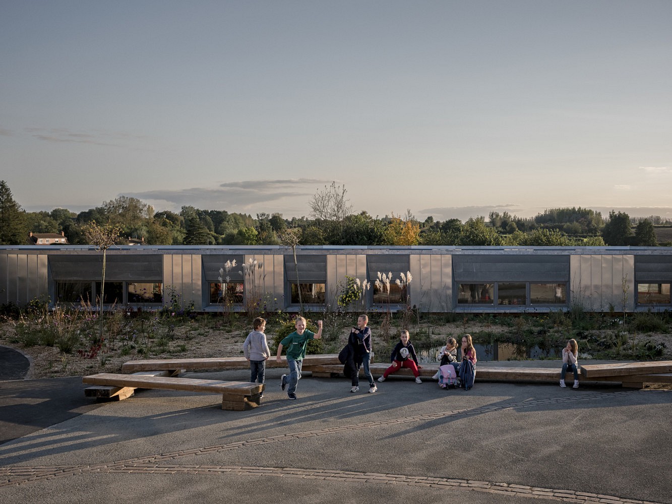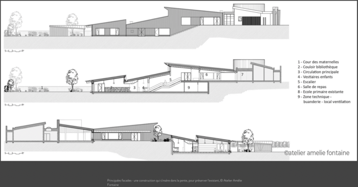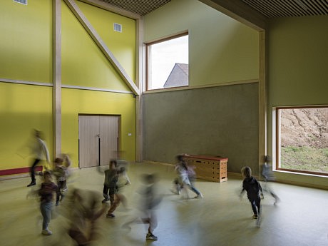 The construction is installed on the slope. The new school is located one level lower than the existing school, constituting a low ground floor level. This arrangement allows the view of the landscape to be preserved from the elementary school. The school's section is designed to ensure air flow (especially nighttime ventilation) and to allow continuous lighting of all teaching and circulation areas. Light autonomy is an asset for energy saving. The whole is built in poplar / straw and raw earth.