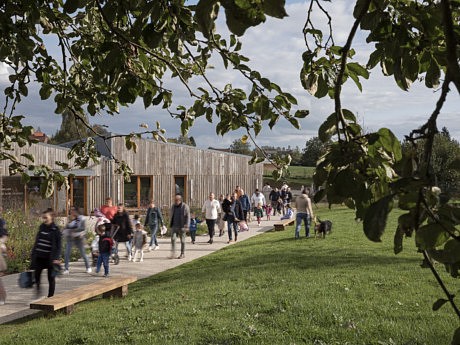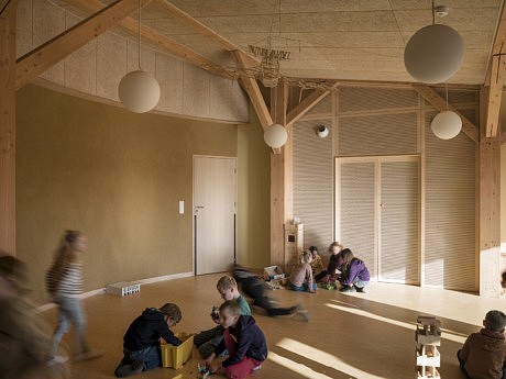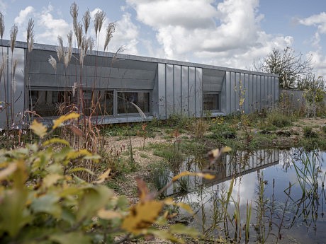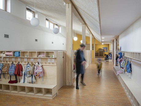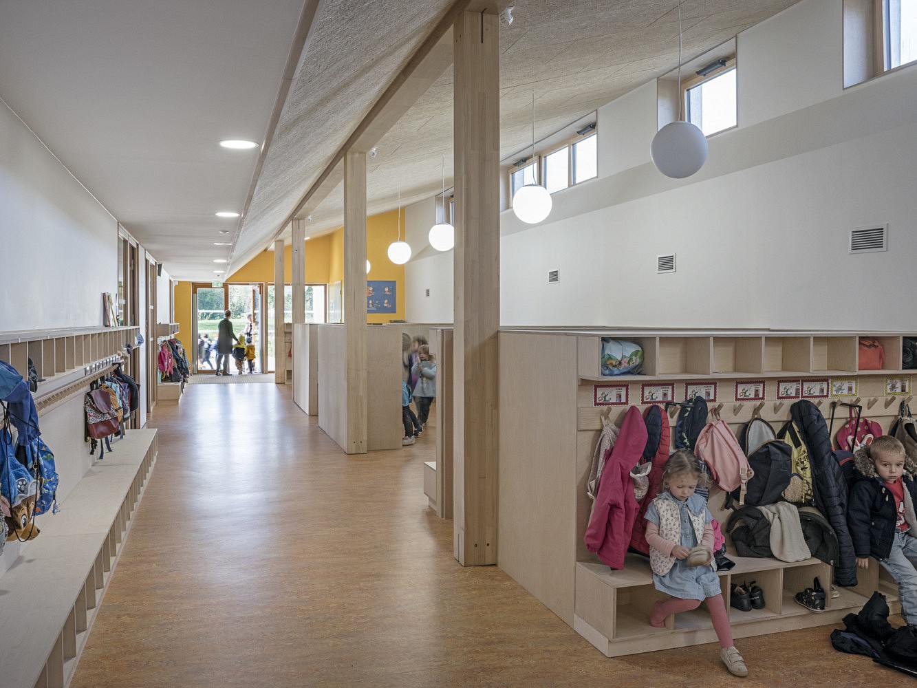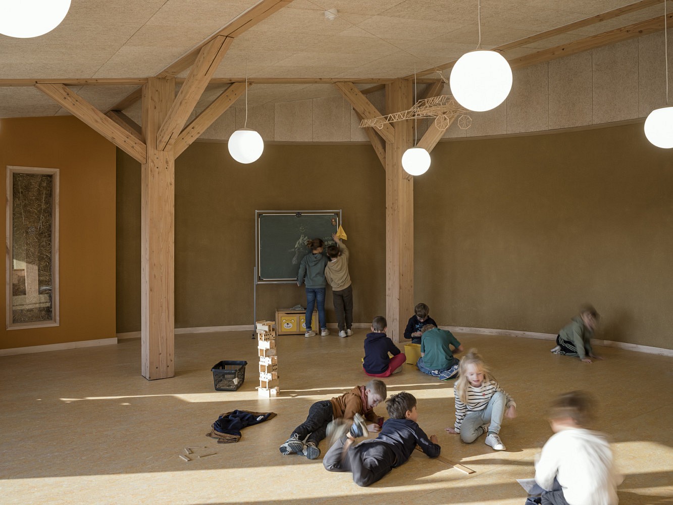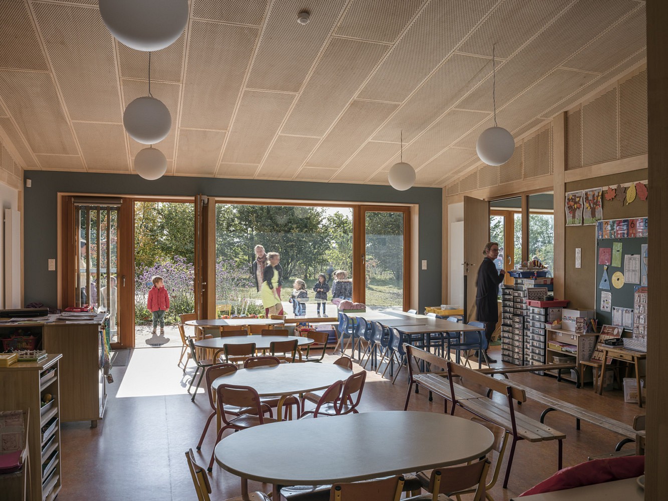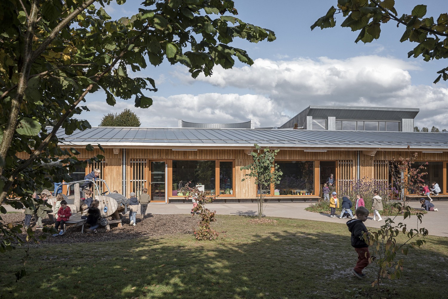 The construction is installed on the slope. The new school is located one level lower than the existing school, constituting a low ground floor level. This arrangement allows the view of the landscape to be preserved from the elementary school. The school's section is designed to ensure air flow (especially nighttime ventilation) and to allow continuous lighting of all teaching and circulation areas. Light autonomy is an asset for energy saving. The whole is built in poplar / straw and raw earth.