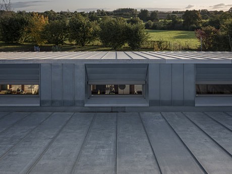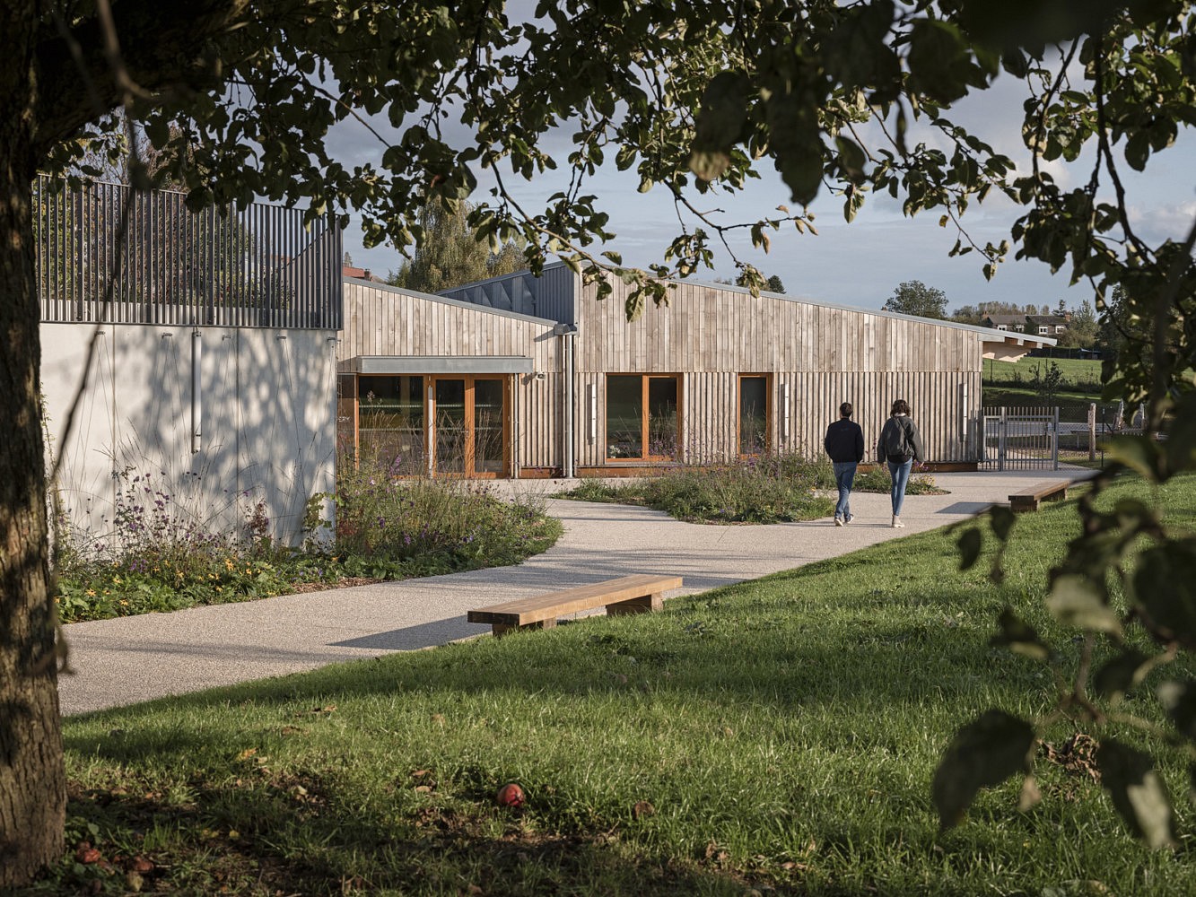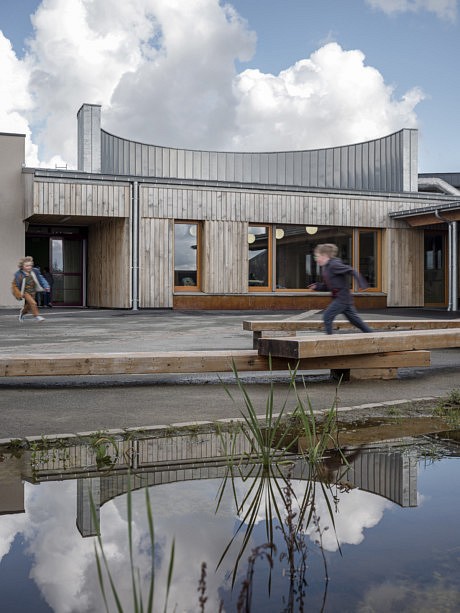 The new construction is located in such a way as to form a square to the South-East of the land, in response to the volume of the existing school, it offers a large south facade open to the Grand Paysage du bocage. The roof overhang forms a cap ensuring summer comfort.