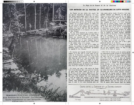 La pureté des eaux de la rivière Touvre contribue à fournir de l’eau potable à l’ensemble de l’agglomération d’Angoulême. Ses quatre “sources“ sont en fait de puissantes résurgences qui apparaissent sous les ruines d’un château pour donner naissance à cet affluent de la Charente, long seulement de 11,7 km. Le Dormant, le Bouillant, la Font de Lussac et la Lèche forment ensemble la deuxième résurgence de France après la Fontaine de Vaucluse, dont le débit moyen élevé (13 m3/s) permet de rendre la Charente navigable à l’embouchure de la Touvre.
