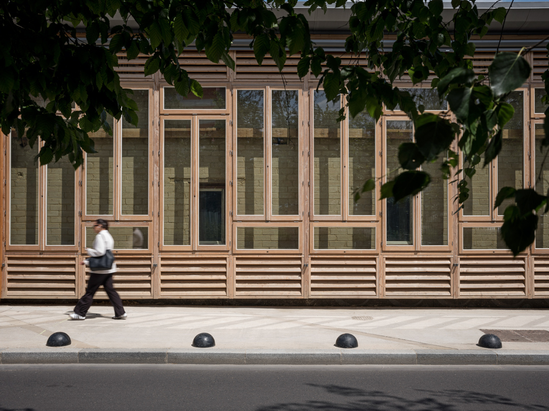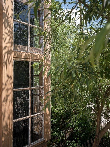 🌞 La maison de la réserve se chauffe au bois et est ventilée naturellement grâce à des cheminées solaires, tout en récupérant la chaleur extraite. L’air rentrant est en plus préchauffé par le soleil, puisé dans un espace tampon composé d’une double façade en fenêtres de réemploi. Un mur trombe en briques BTC s’affiche côté rue derrière une façade vitrée en réemploi. Les eaux pluviales sont stockées sous le bâtiment pour alimenter les sanitaires et l’arrosage des végétaux.
