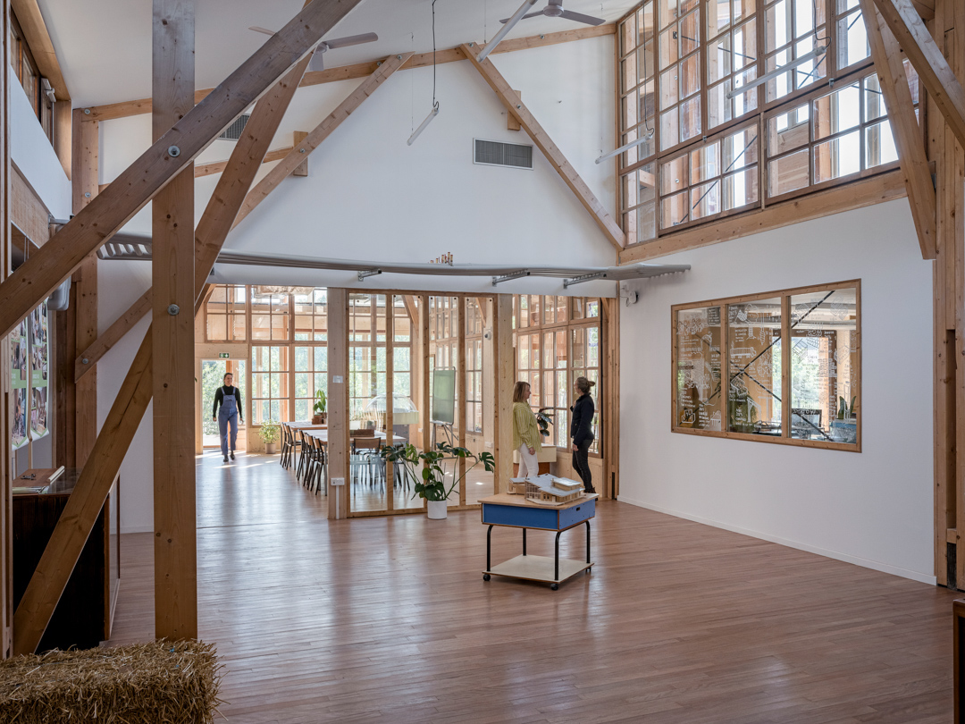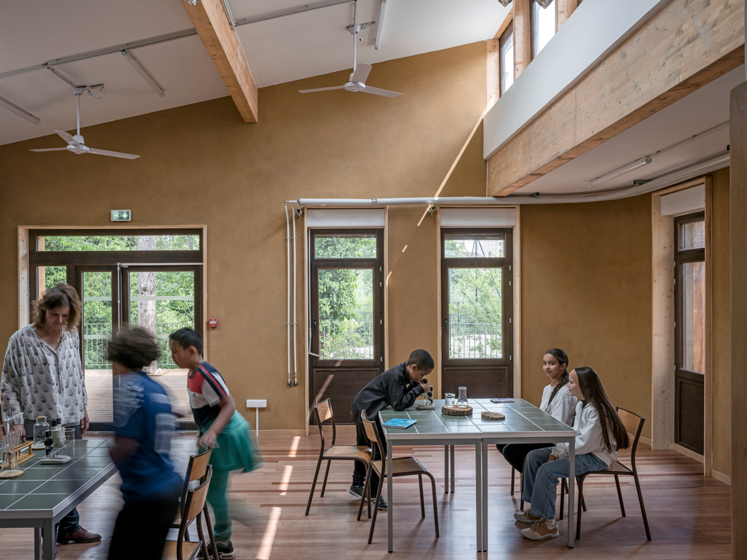 🪵 La terre crue, sous forme d’enduit et de briques BTC, s’associe au bois, en structure et parquet de réemploi, pour offrir des ambiances intérieures chaleureuses et confortables, baignées de lumière naturelle. »