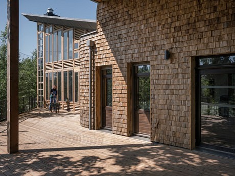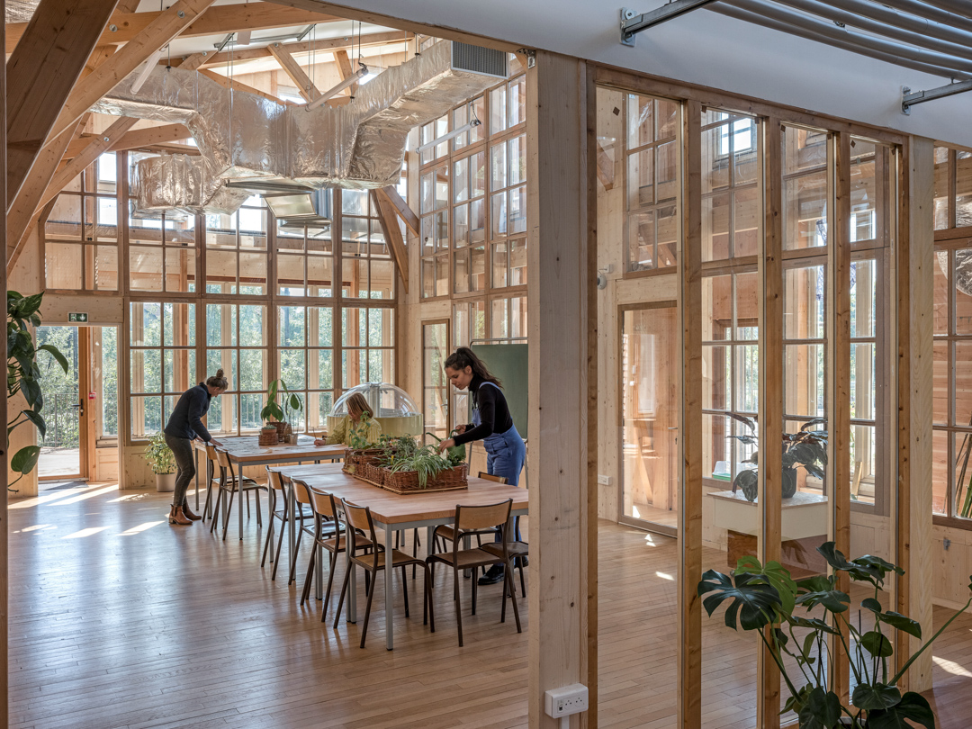 🌳 Conçu sans béton, en hashtagbois, hashtagterre, hashtagpaille, hashtagréemploi, et tout revêtu de tavaillons de châtaigner, le bâtiment est un véritable nichoir pour la biodiversité environnante. Fondé sur pieux vissés, il peut s’approcher au plus près des arbres sans leur nuire.